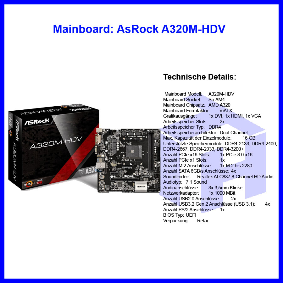 ASRock A320M-HDV AMD A320 So.AM4 Dual Channel DDR4 mATX Retail 90-MXB9L0-A0UA... | 2020-06-07 09:53 | 184k |